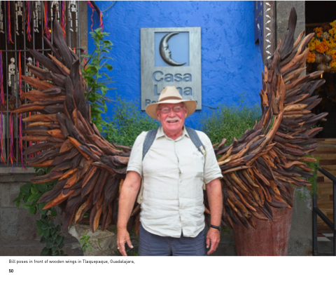 Bill poses in front of wooden wings in Tlaquepaque, Guadalajara, 50