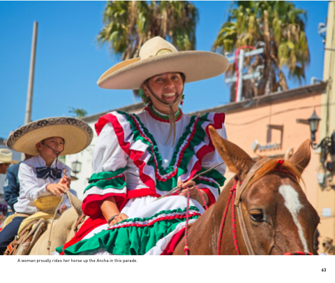 A woman proudly rides her horse up the Ancha in this parade. 63