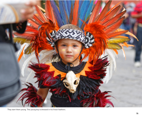 They start them young. This young boy is dressed in his finest feathers. 75