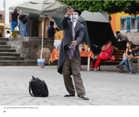 A mime entertains the folks in Plaza Civica. 90