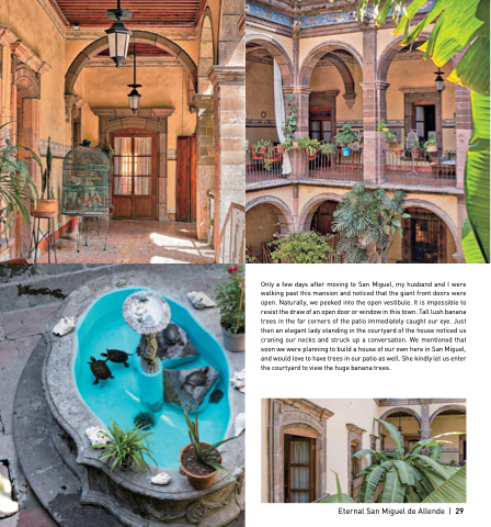 Only a few days after moving to San Miguel, my husband and I were walking past this mansion and noticed that the giant front doors were open. Naturally, we peeked into the open vestibule. It is impossible to resist the draw of an open door or window in this town. Tall lush banana trees in the far corners of the patio immediately caught our eye. Just then an elegant lady standing in the courtyard of the house noticed us craning our necks and struck up a conversation. We mentioned that soon we were planning to build a house of our own here in San Miguel, and would love to have trees in our patio as well. She kindly let us enter the courtyard to view the huge banana trees.