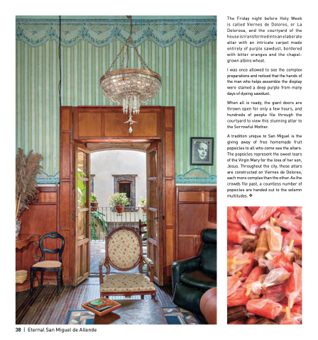 The Friday night before Holy Week is called Viernes de Dolores, or La Dolorosa, and the courtyard of the house is transformed into an elaborate altar with an intricate carpet made entirely of purple sawdust, bordered with bitter oranges and the chapel- grown albino wheat.