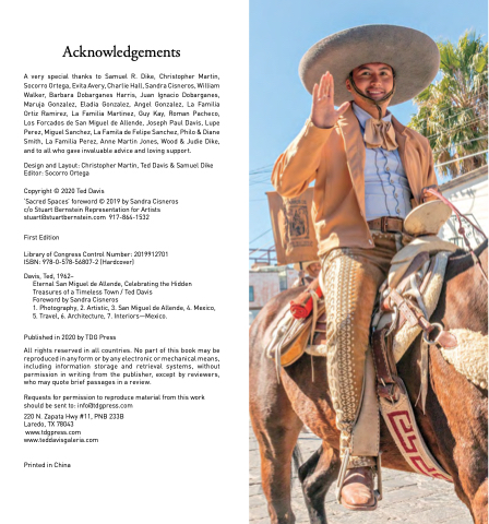 A very special thanks to Samuel R. Dike, Christopher Martin, Socorro Ortega, Evita Avery, Charlie Hall, Sandra Cisneros, William Walker, Barbara Dobarganes Harris, Juan Ignacio Dobarganes, Maruja Gonzalez, Eladia Gonzalez, Angel Gonzalez, La Familia Ortiz Ramirez, La Familia Martinez, Guy Kay, Roman Pacheco, Los Forcados de San Miguel de Allende, Joseph Paul Davis, Lupe Perez, Miguel Sanchez, La Famila de Felipe Sanchez, Philo & Diane Smith, La Familia Perez, Anne Martin Jones, Wood & Judie Dike, and to all who gave invaluable advice and loving support.