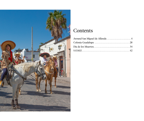 Around San Miguel de Allende . . . . . . . . . . . . . . . . . . . . . 4 Colonia Guadalupe . . . . . . . . . . . . . . . . . . . . . . . . . . . . . . 28 Día de los Muertos . . . . . . . . . . . . . . . . . . . . . . . . . . . . . . . 34 S .O .M .E . . . . . . . . . . . . . . . . . . . . . . . . . . . . . . . . . . . . . . . . . 42