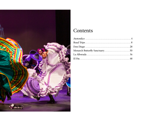 Atotonilco . . . . . . . . . . . . . . . . . . . . . . . . . . . . . . . . . . . . . . .4 Road Trips . . . . . . . . . . . . . . . . . . . . . . . . . . . . . . . . . . . . . . . 8 Don Diego . . . . . . . . . . . . . . . . . . . . . . . . . . . . . . . . . . . . . . 28 Monarch Butterfly Sanctuary . . . . . . . . . . . . . . . . . . . . . . 30 La Alborada . . . . . . . . . . . . . . . . . . . . . . . . . . . . . . . . . . . . . 36 El Fin . . . . . . . . . . . . . . . . . . . . . . . . . . . . . . . . . . . . . . . . . . . 48